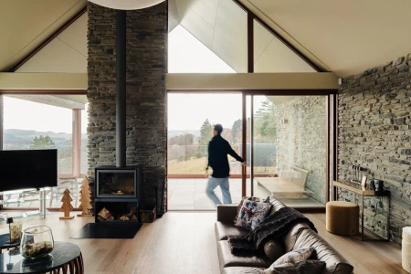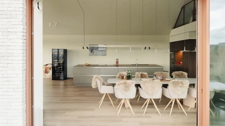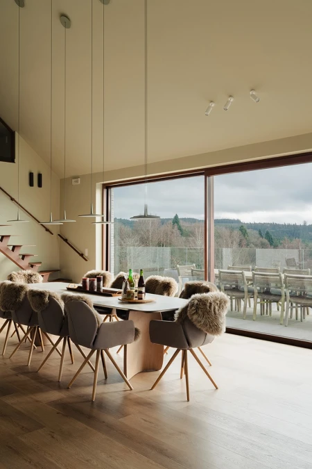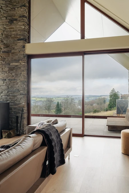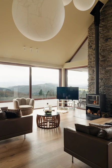 Bij aankomst valt meteen het adembenemende uitzicht op. Dankzij de grote raampartijen wordt het panoramische landschap als een levend schilderij naar binnen gehaald. Er werd bewust gekozen voor een open indeling, zodat licht en ruimte centraal staan. Elk detail in het interieur versterkt dat gevoel van harmonie met de natuur.
