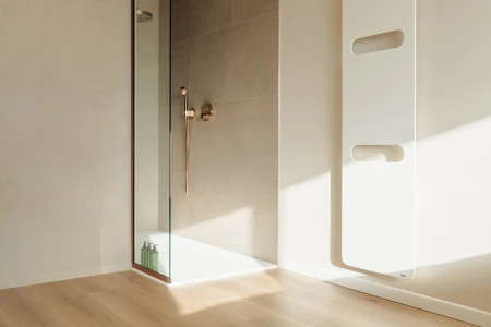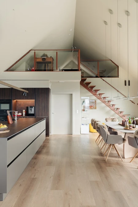 Voor de vloerafwerking viel de keuze op Parquetvinyl. Een beslissing die zowel esthetisch als praktisch perfect aansluit bij het concept van de woning. De natuurlijke houtlook brengt warmte in de moderne ruimtes, terwijl de onderhoudsvriendelijke eigenschappen ideaal zijn voor een vakantiewoning die intensief gebruikt wordt. Het resultaat? Een vloer die niet alleen prachtig oogt, maar ook bestand is tegen het leven van alledag.
